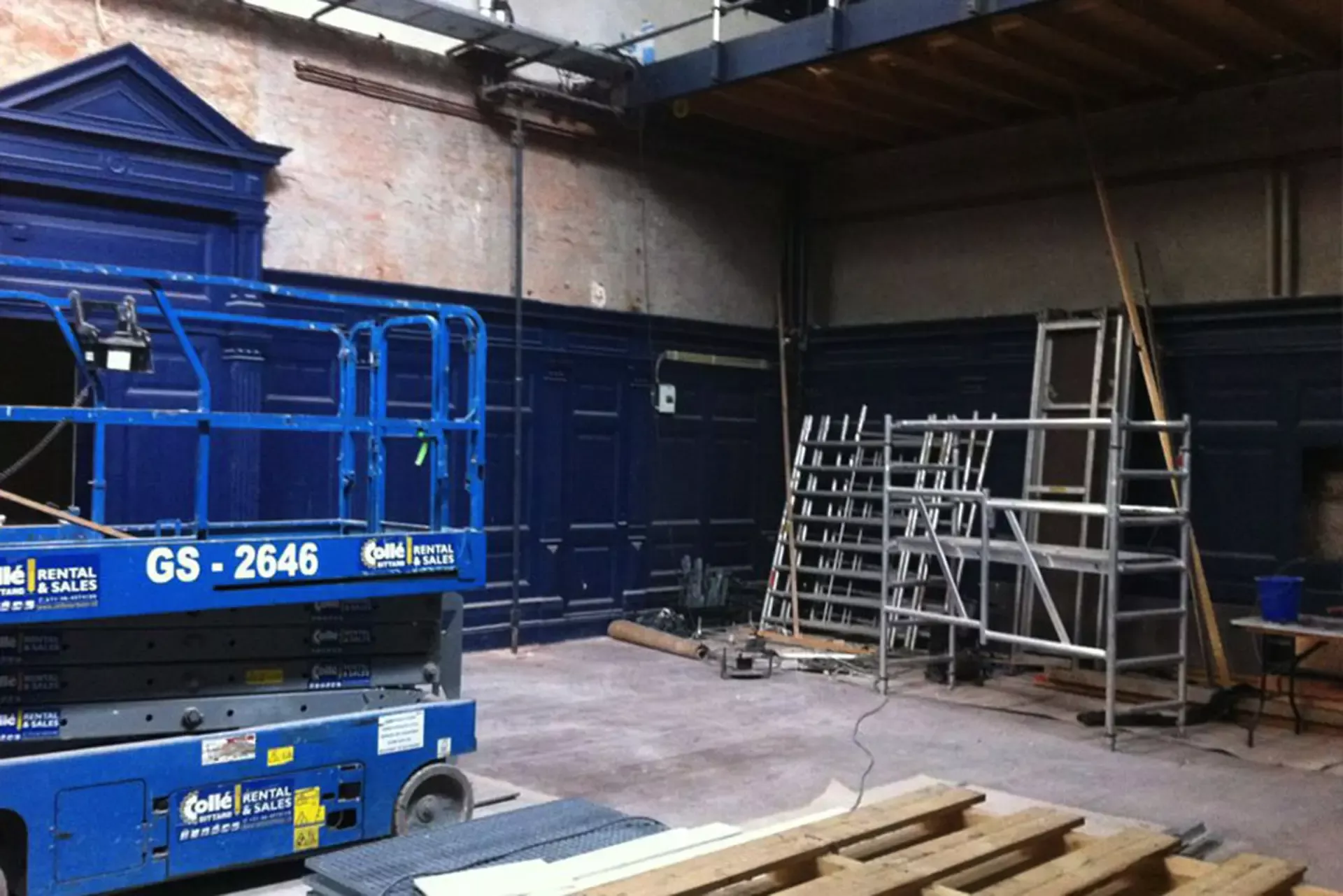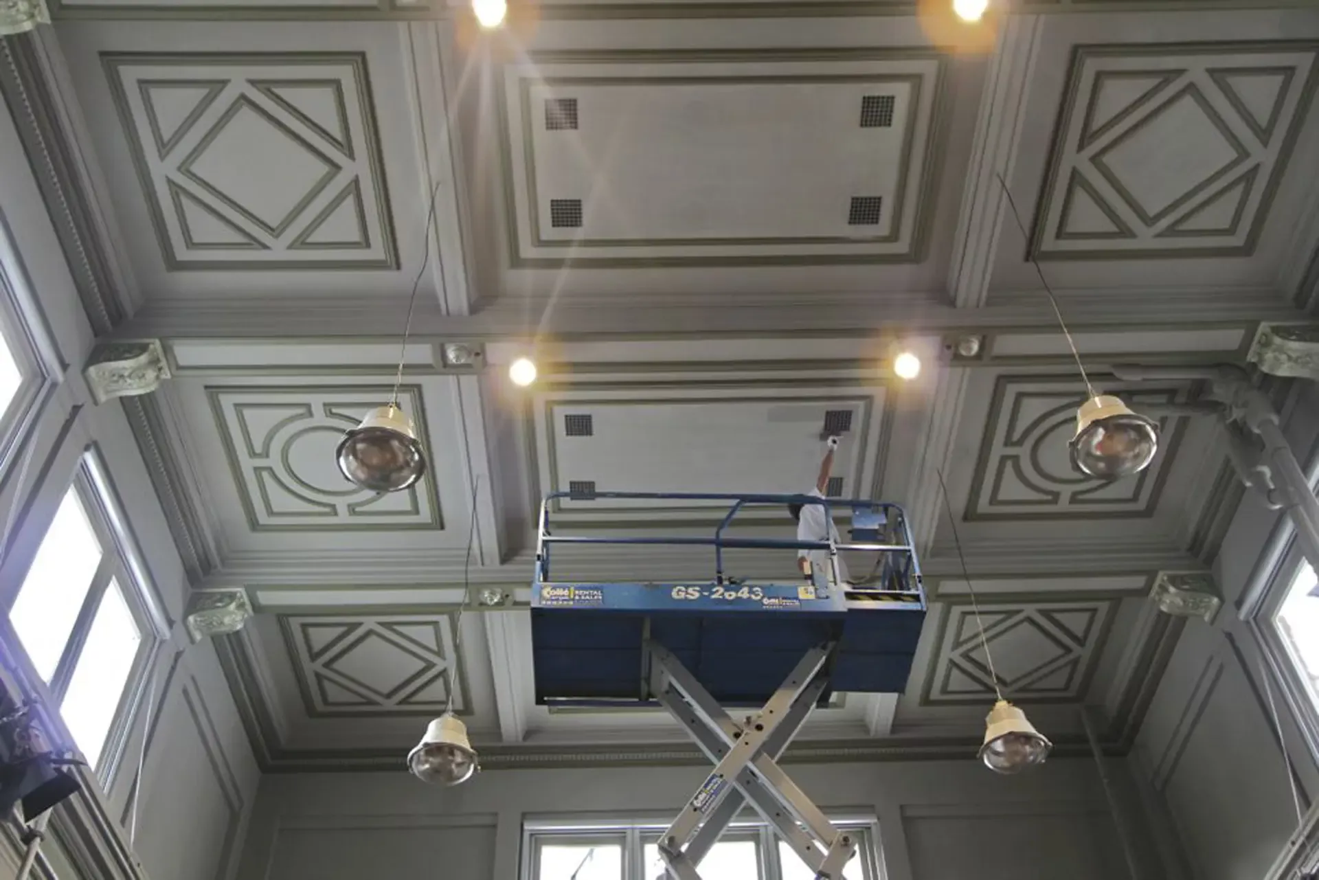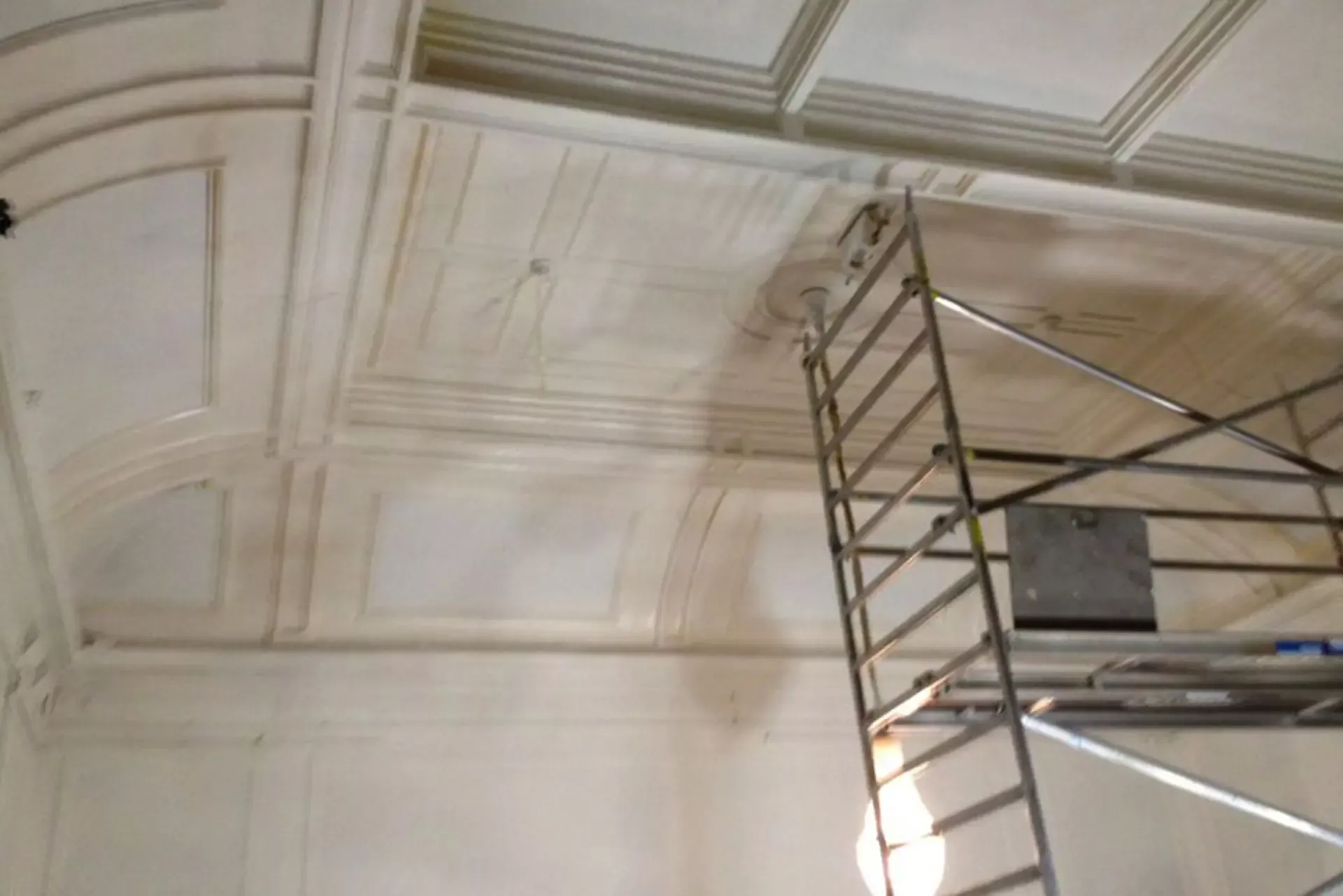 De Balie, gelegen aan het Leidseplein, is een icoon in Amsterdam. Recent hebben wij de renovatie voltooid van de Grote Zaal, Kleine Zaal, Bioscoop en het restaurant met foyer. Ondanks de strakke planning van maximaal één week per zaal, waarbij De Balie open bleef voor het publiek, hebben wij alle werkzaamheden nauwkeurig uitgevoerd. Na de nodige reparaties hebben we de wanden en plafonds zorgvuldig gespoten, terwijl de sierlijsten op de plafonds zijn afgewerkt met een subtiel contrasterende kleur, wat de ruimtes een elegante uitstraling geeft.